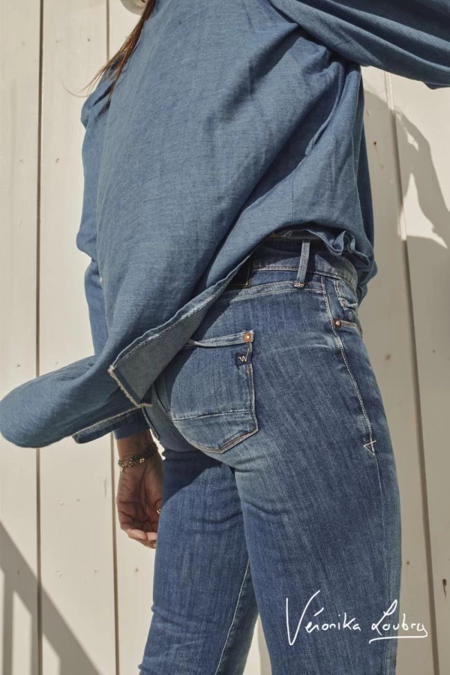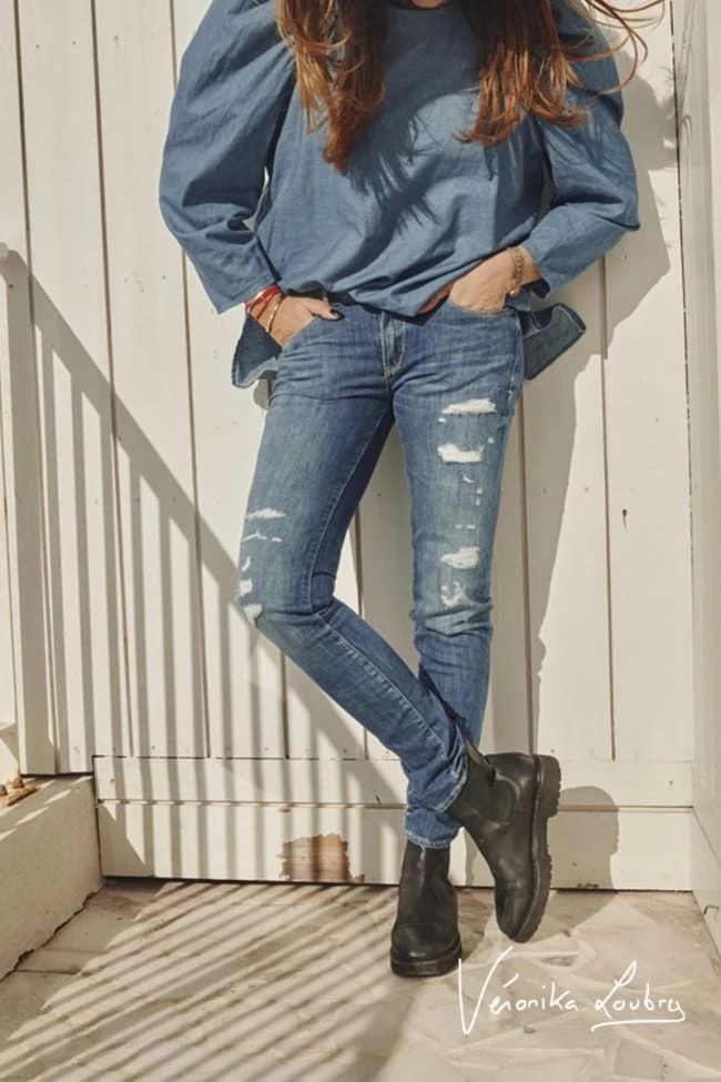 Le 300/16 slim by Véronika Loubry, avec ses abrasions et trous réparés à l’avant et sur la poche arrière, est un essentiel tendance du dressing féminin.
