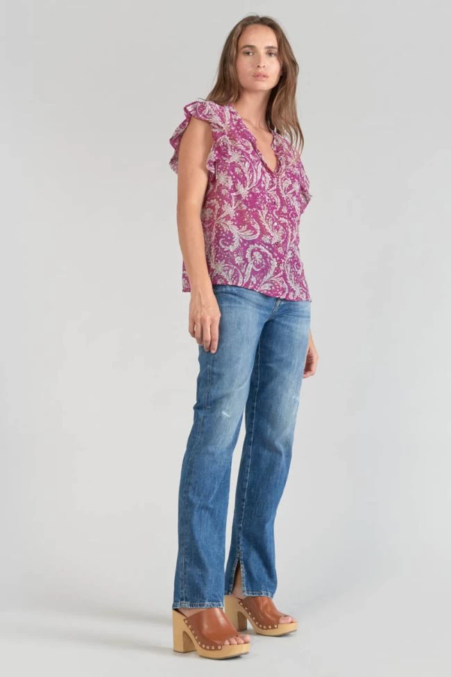 Cette blouse Suri est très féminine avec son motif cachemire blanc sur fond violine, ses volants au niveau des épaules et son tissu en voile légèrement transparent idéal pour la saison estivale. Les deux poches poitrine carrées et les boutons argentés apportent du style à la pièce.