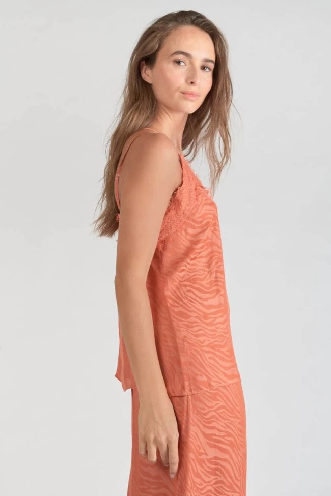Ce caraco Ayek est très féminin et raffiné grâce à son jacquard fluide au motif zébré et son encolure en dentelle à l’avant et à l’arrière. Pour plus de style, ses fines bretelles sont doubles et croisées dans le dos, et pour plus de confort, ces dernières sont réglables.
