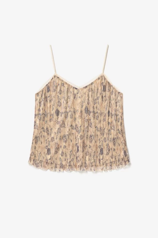 Ce caraco Kava vous donnera un look féminin élégant avec son tissu plissé doré à motif fleuri et sa fine dentelle au niveau de l’encolure à l’avant. Pour plus de confort, les fines bretelles sont réglables et le top est doublé.