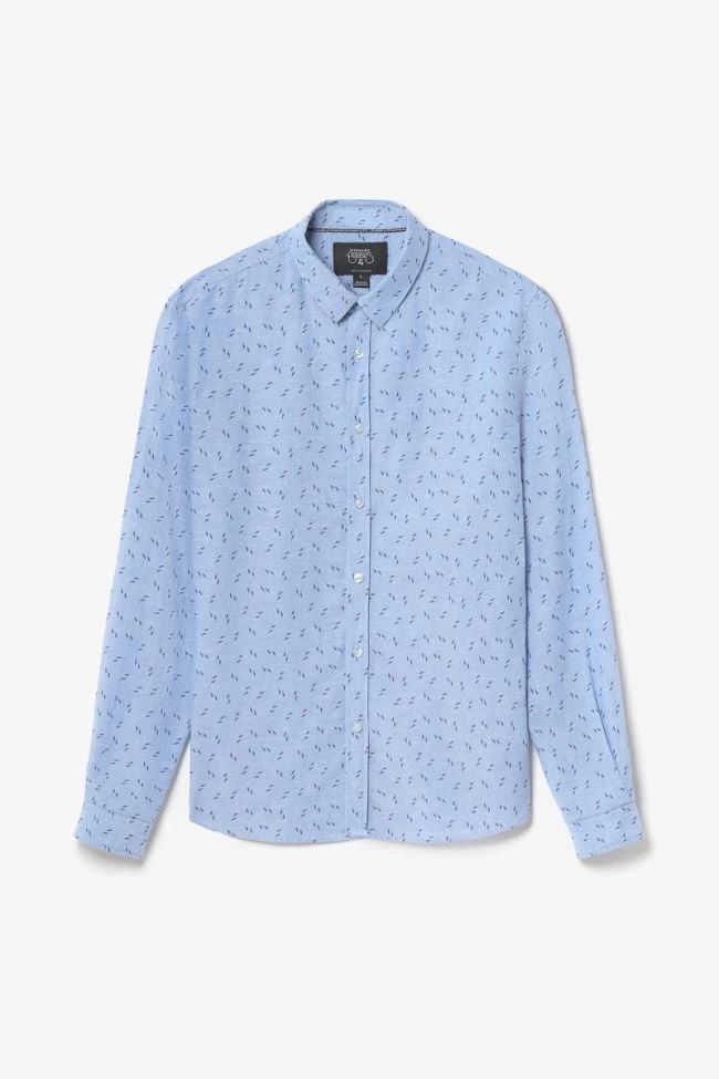 Cette chemise Arpe vous donnera un look tendance avec son tissu en lin mélangé et son motif avec de petits éclairs bleu foncé. Pour le détail, des boutons nacrés blancs, des poignets aux revers avec liseré personnalisé « Le Temps des Cerises » et un mini liseré drapeau bleu, blanc, rouge dans le dos.