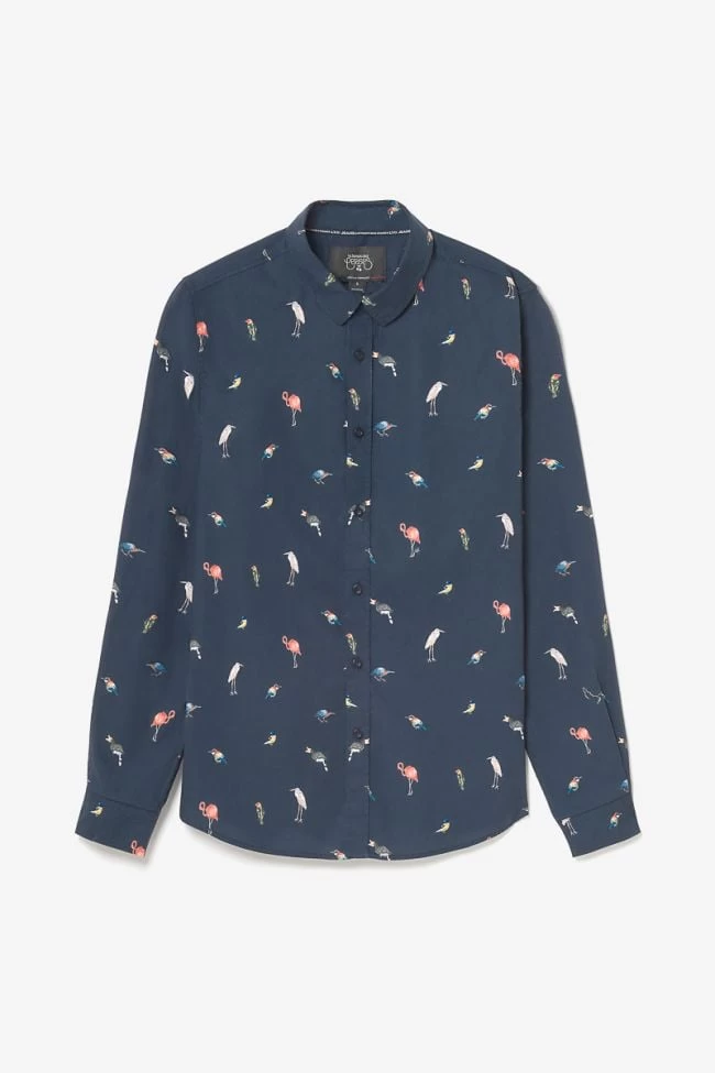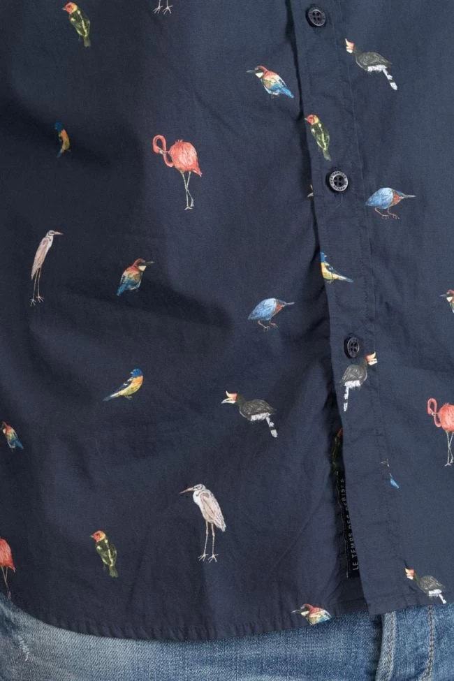 Cette chemise Birdy apportera une touche tendance à toutes vos tenues avec son motif oiseaux multicolores. Pour le détail, des boutons nacrés bleus, des poignets aux revers avec liseré personnalisé « Le Temps des Cerises » et un mini liseré drapeau bleu, blanc, rouge dans le dos.