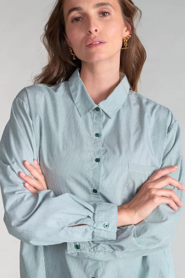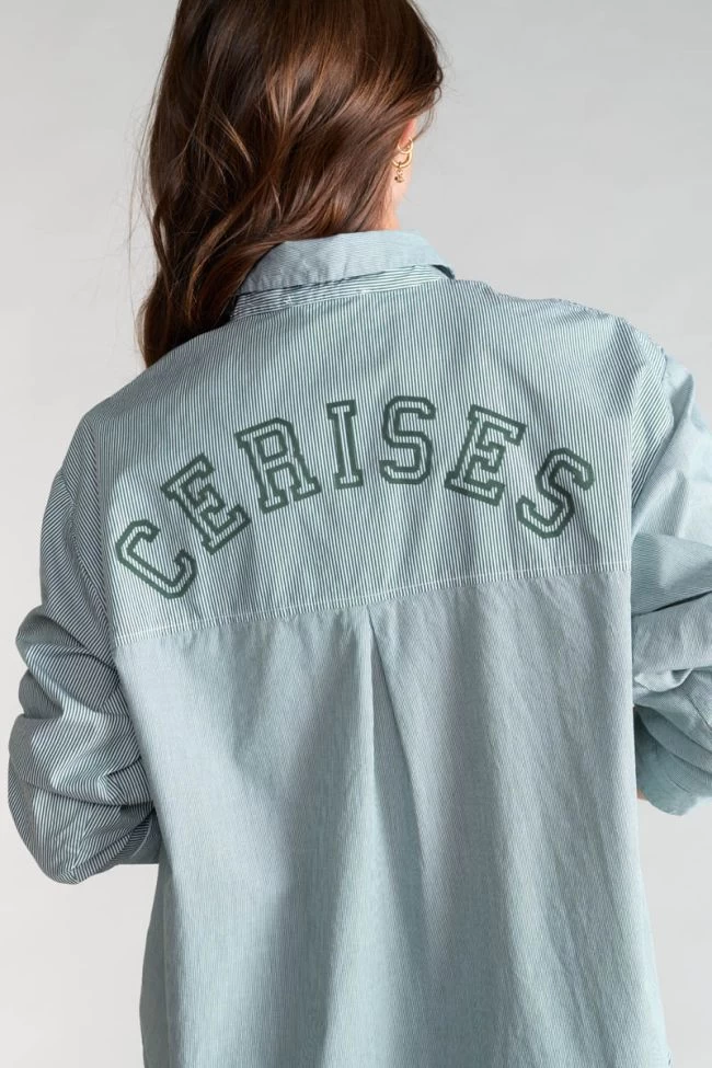 Chemise Ginagi à la pointe de la mode avec sa coupe longue oversize, ses rayures vertes de différentes tailles et son imprimé velours vert Cerises au dos.