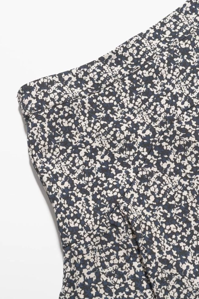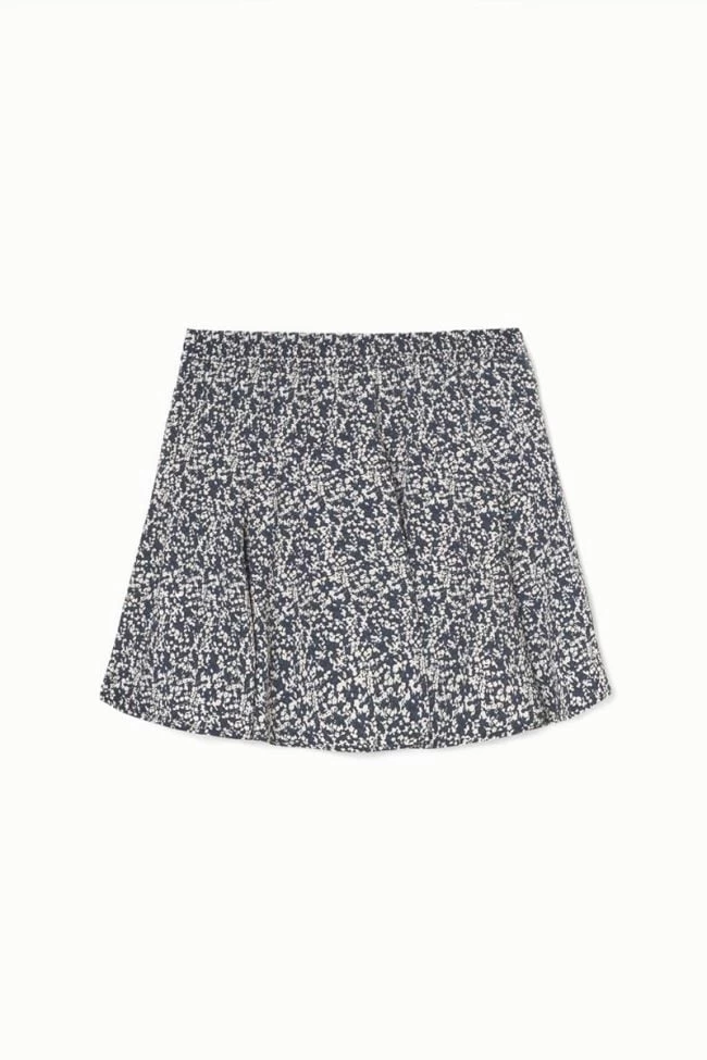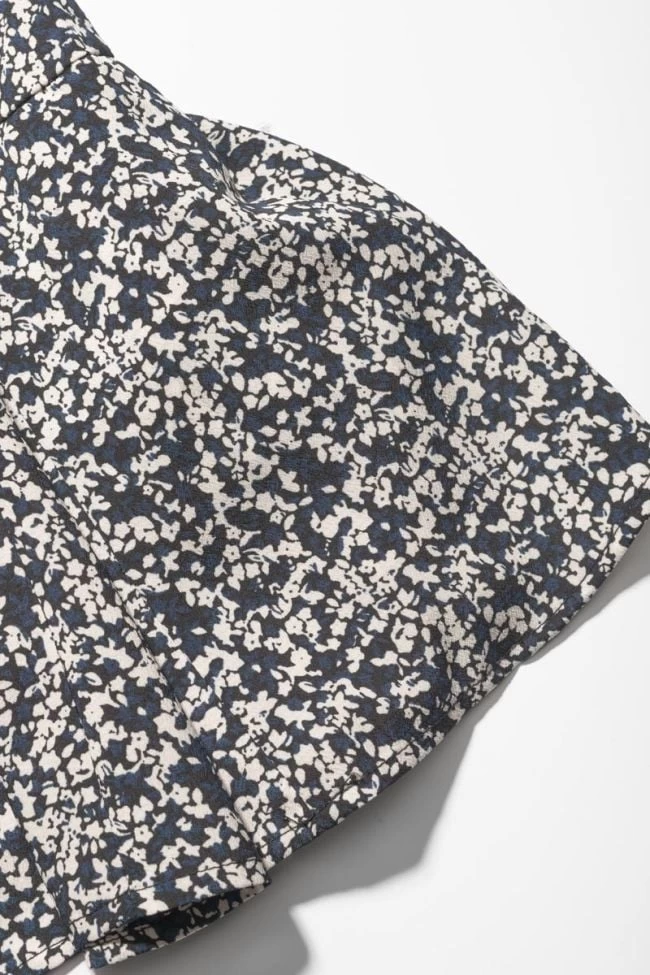 Jupe short Onourisgi à motif floral bleu nuit et blanc avec taille élastiquée et tissu fluide pour plus de confort.