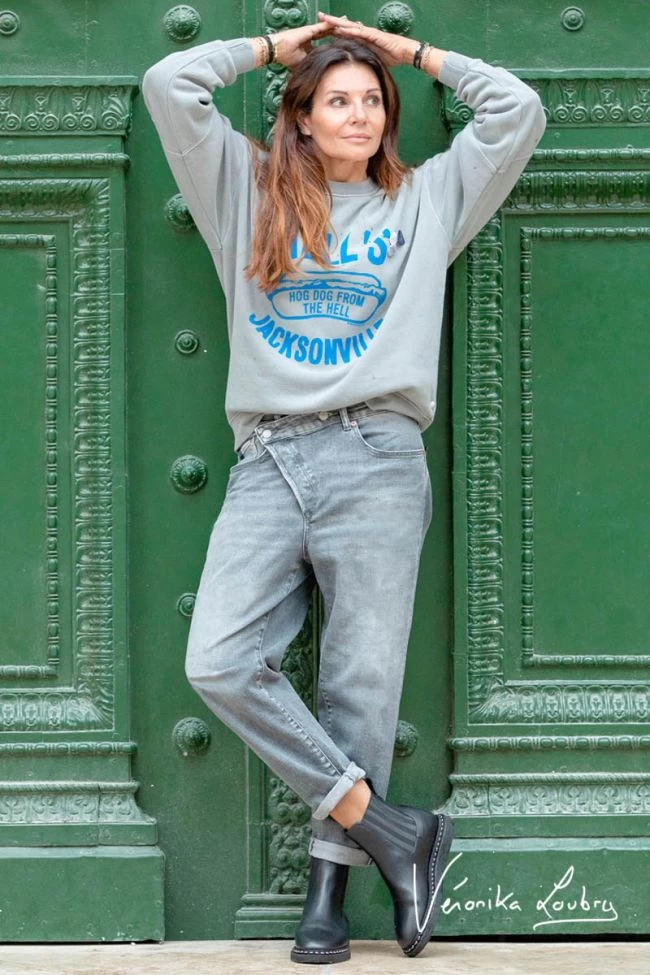 Ce jeans loose est le jeans tendance et original de cette collab, avec sa fermeture à boutons asymétrique. Décliné en gris, il peut se porter avec des baskets pour un look casual très tendance ou avec des talons pour un look élégant à la pointe de la mode.