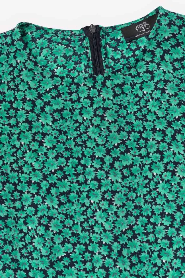 Robe Aliyagi idéale pour la saison estivale avec son tissu léger et son imprimé à motif vert et bleu marine. Sa taille élastiquée de chaque côté, ses manches larges et son volant sur le bas apportent un côté girly. Pour plus de confort, une fermeture zippée invisible au dos permet d’enfiler la robe plus facilement.