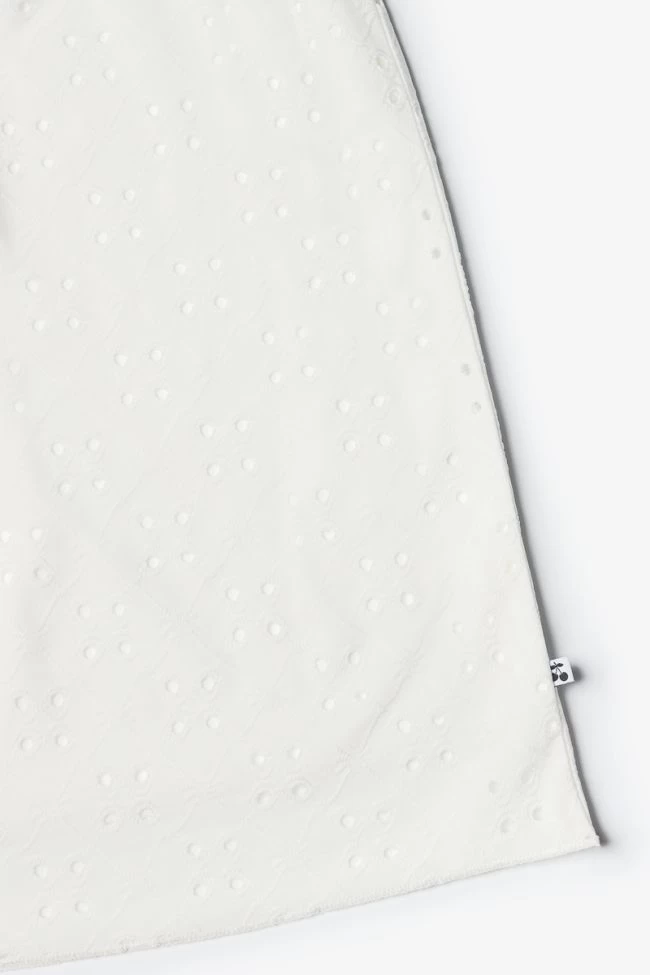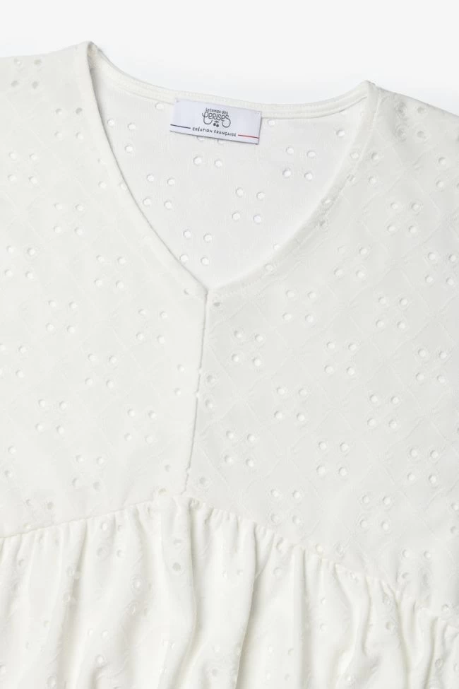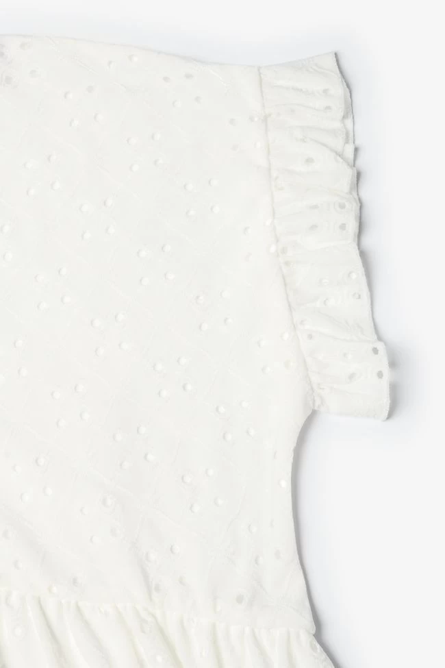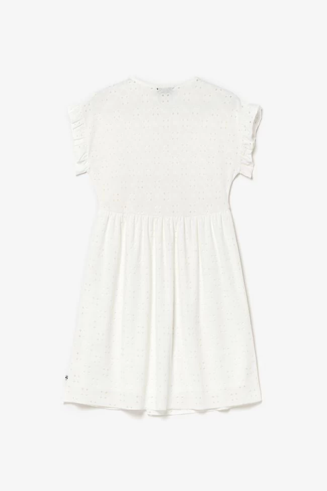 Robe Liagi très élégante avec son jersey blanc ajouré pour donner un effet dentelle, son col V et ses volants au niveau des épaules. Pour plus de confort, la robe est doublée sur la partie basse.