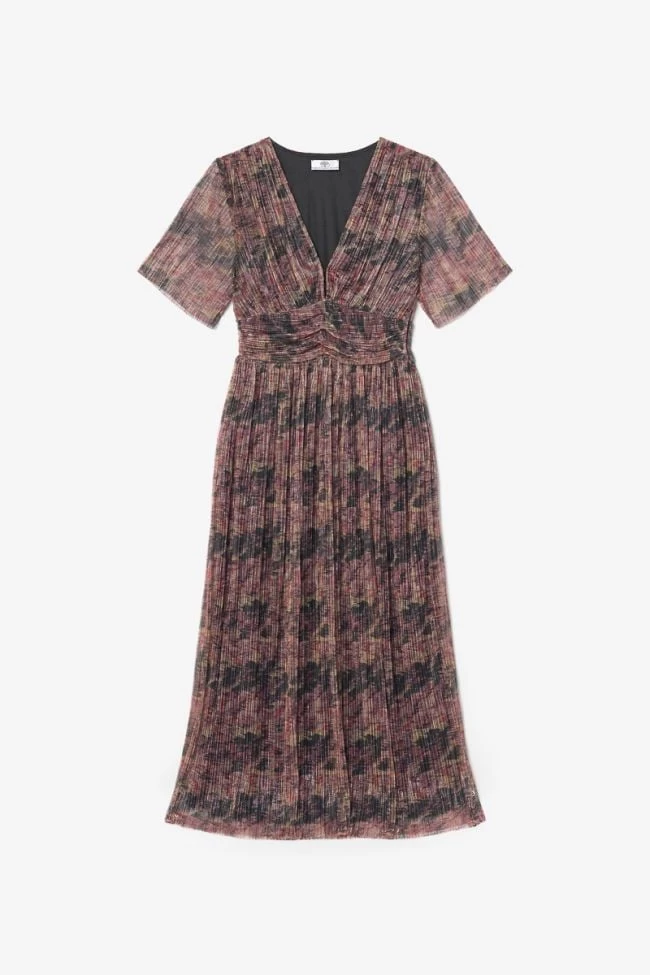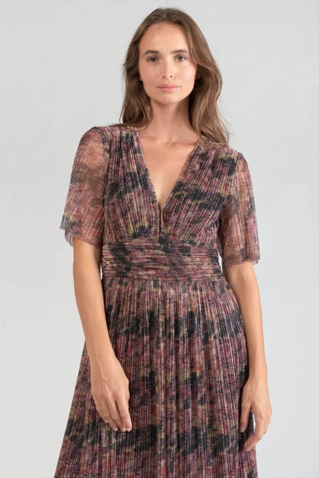 Cette robe longue Amiel est idéale pour vos soirées habillées avec son tissu plissé à l’imprimé original irisé, sa taille drapée pour mettre en valeur la poitrine, ses manches courtes transparentes et son col en V très féminin. Pour plus de confort, une fermeture zippée invisible sur le côté, un crochet pour ajuster l’ouverture du col et une doublure sur toute la longueur.