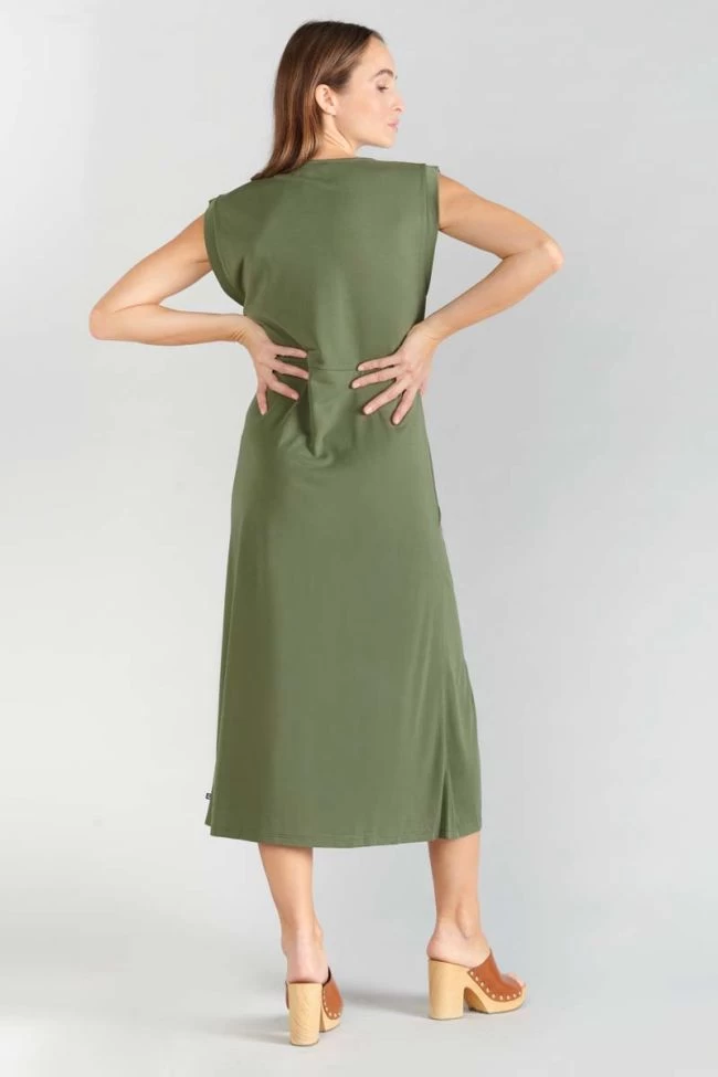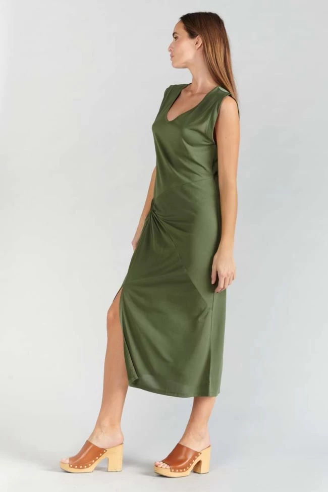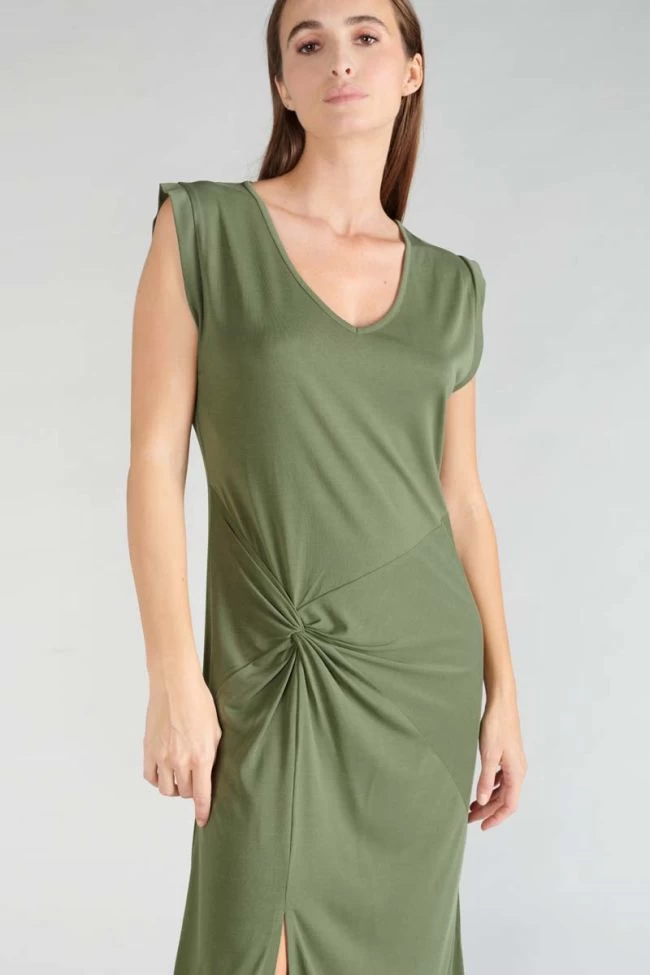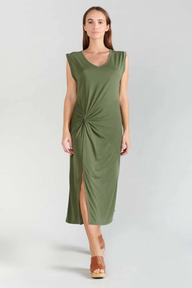 Cette robe sans manches Gana en modal kaki est très élégante avec son nœud sur la hanche et sa fente sur la jambe. Son tissu fluide et doux est très agréable à porter.