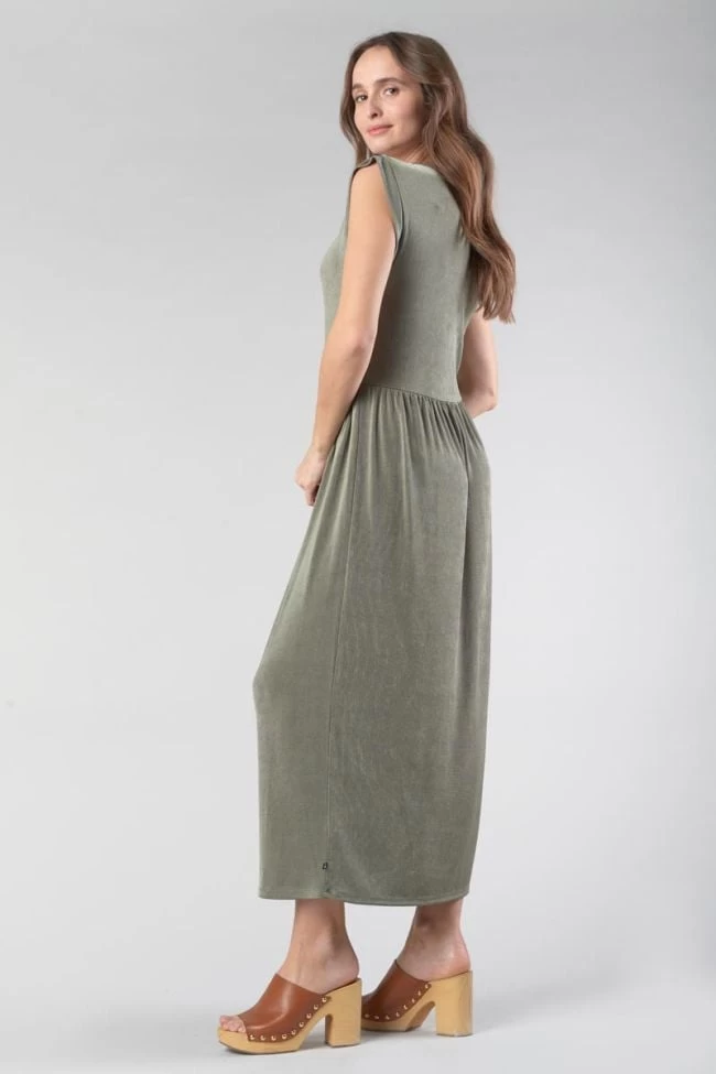 Cette robe Nata sans manches est très élégante et raffinée avec sa coupe longue, son tissu kaki légèrement brillant et son liseré doré au niveau du col. Pour plus de confort, le tissu doux et fluide est agréable à porter.