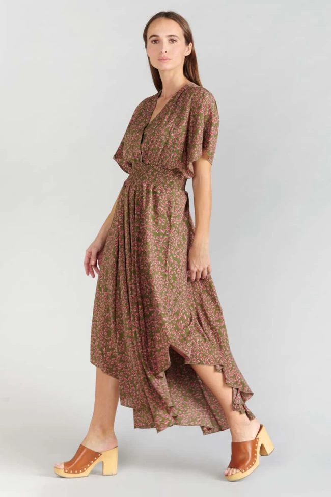 Cette robe Yaka kaki est très féminine avec son motif fleuri rose, son col V, ses manches larges et sa taille smockée pour mettre en valeur la silhouette. Pour plus de confort, un bouton pression ferme le col V et la robe est doublée.