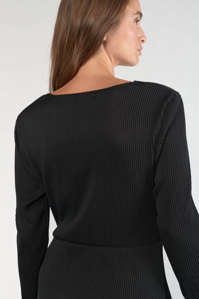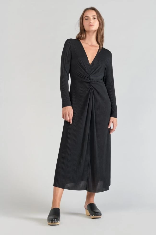 Cette robe Yama est parfaite pour être élégante et féminine lors de vos soirées avec sa coupe longue, son tissu noir plissé très raffiné, et son jeu de fronces au niveau de la taille.