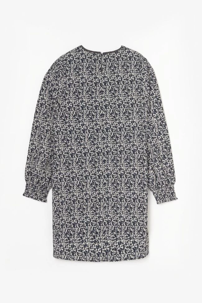 Robe Meyagi très raffinée avec son motif floral bleu nuit et blanc, son encolure habillée d’un joli liseré argenté, ses manches bouffantes et ses poignets smockés. Pour plus de confort, une ouverture goutte fermée par un bouton dans le dos et une doublure complètent la pièce.