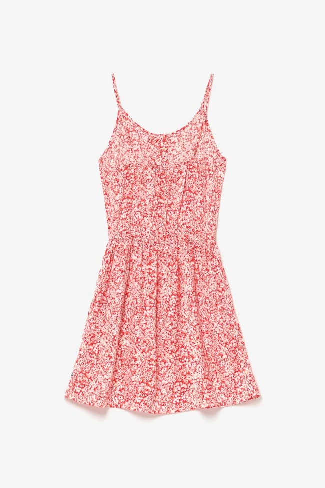 Robe Yuligi à fines bretelles idéale pour la saison estivale et à motif floral rose et rouge qui apporte de la fraicheur. Sa taille est élastiquée pour cintrer la robe et de petits boutons rouges ferment la robe sur la partie haute. Pour plus de confort, ses fines bretelles sont réglables.