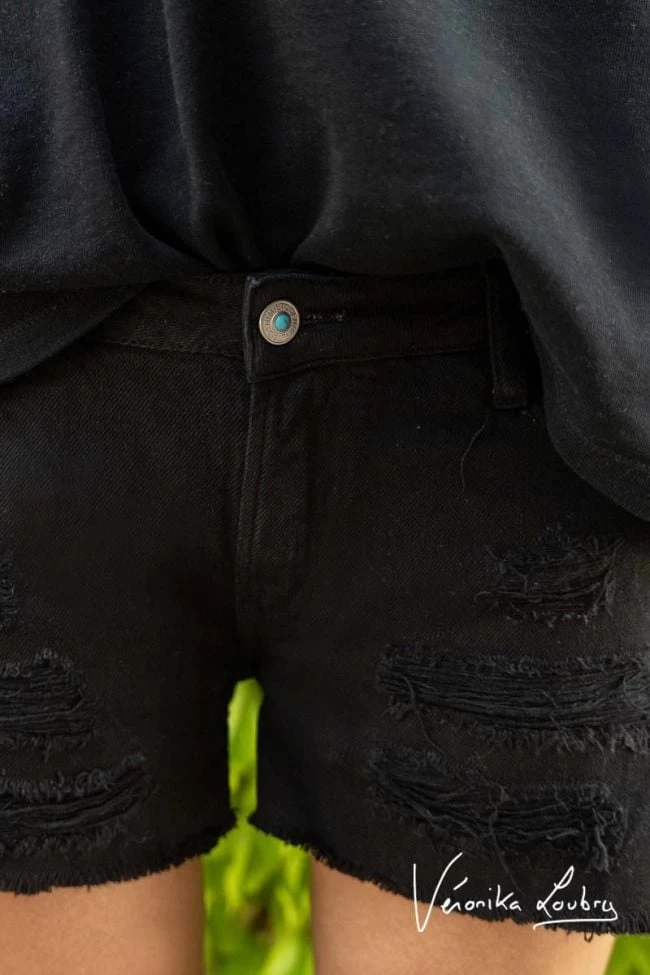 Le short Véronika, véritable indispensable du dressing estival, se décline en jeans brut noir et se pare d’abrasions et trous réparés pour donner un côté rock tendance. Sa coupe courte habillée de bords effilochés apporte encore plus de style à la pièce. Pour le détail, un bouton bijou orné d’une pierre turquoise vient sublimer la pièce.