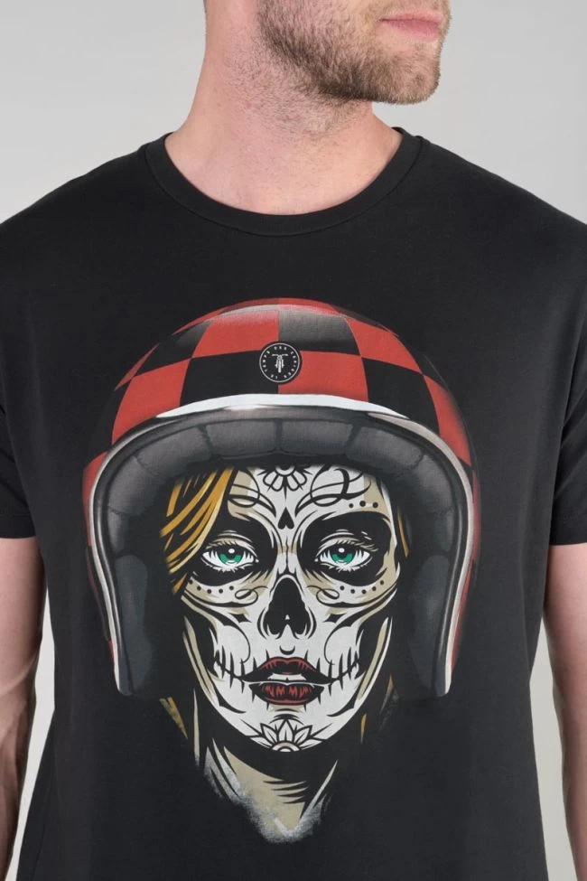 Ce t-shirt Diarov noir a un look rock avec son imprimé fantaisie et son écusson Le Temps des Cerises sur la manche gauche.