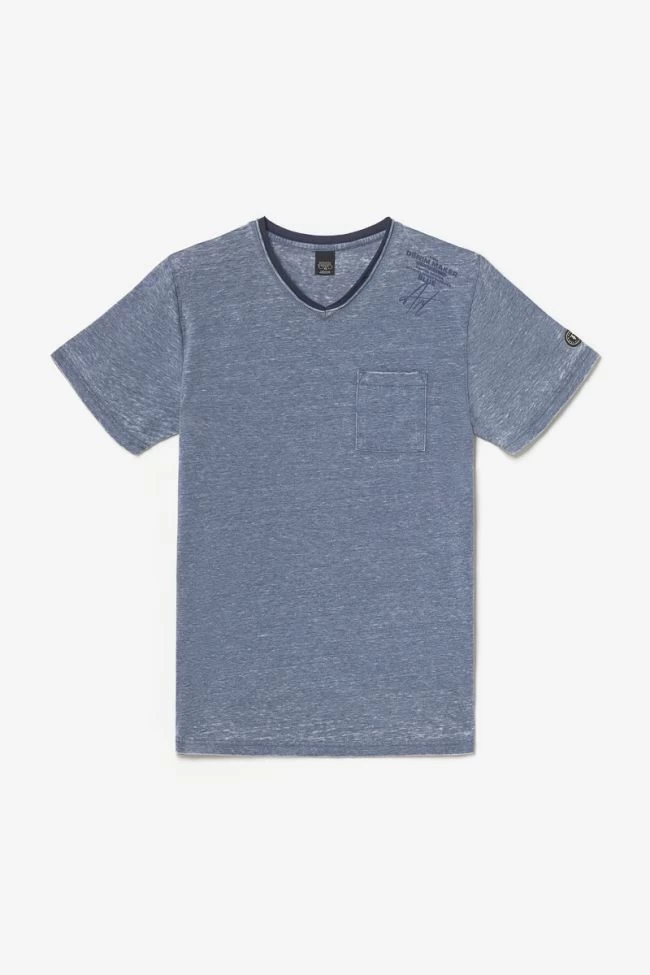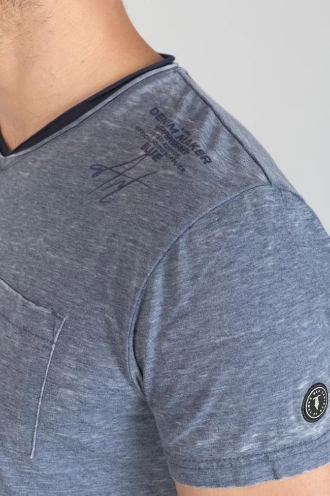 Ce t-shirt Mavoc a un look casual avec son tissu léger bleu chiné à l’effet délavé, son col en V double bicolore avec bords roulottés et son inscription bleu au niveau de l’épaule gauche. Pour le détail, une poche poitrine et un écusson Le Temps des Cerises sur la manche gauche.