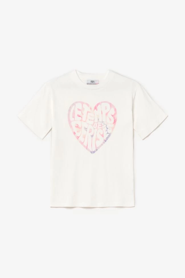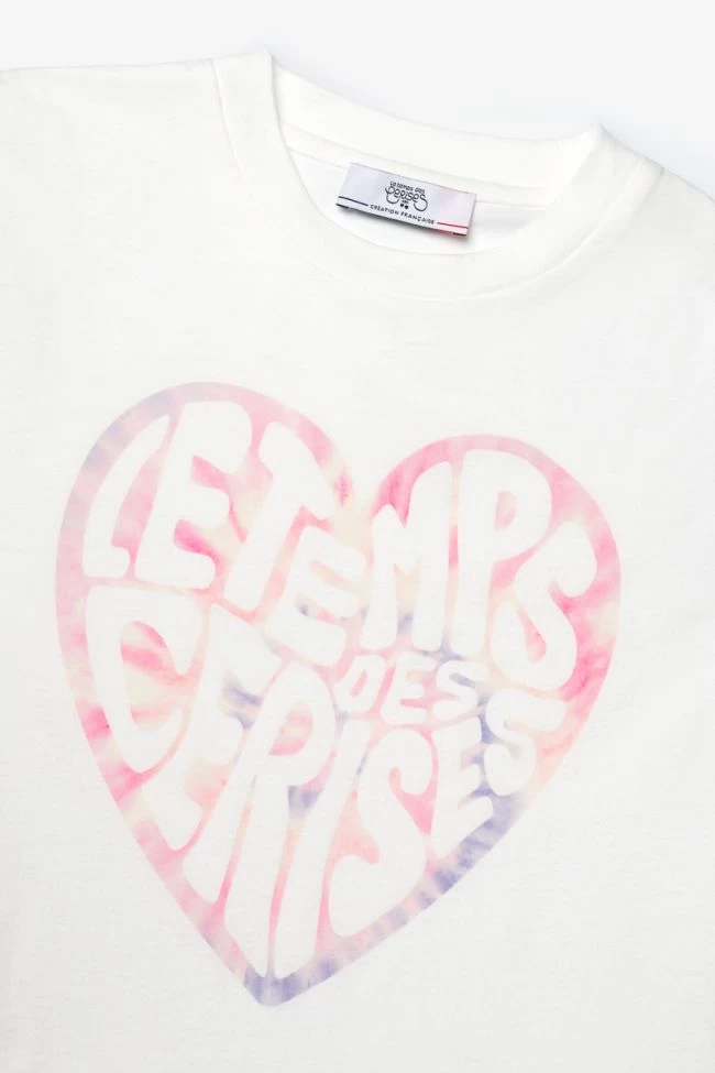 T-shirt Moonagi blanc très girly avec son imprimé cœur à motif tie and dye dans les tons de rose et violet personnalisé Le Temps des Cerises.