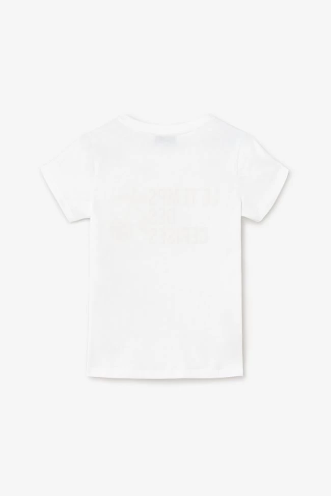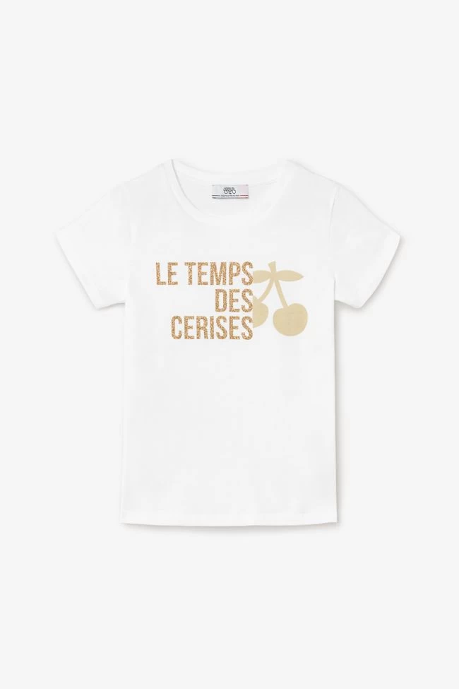 T-shirt Nastiagi ecru très girly avec son imprimé Le Temps des Cerises à paillettes dorées et ses Cerises beiges.