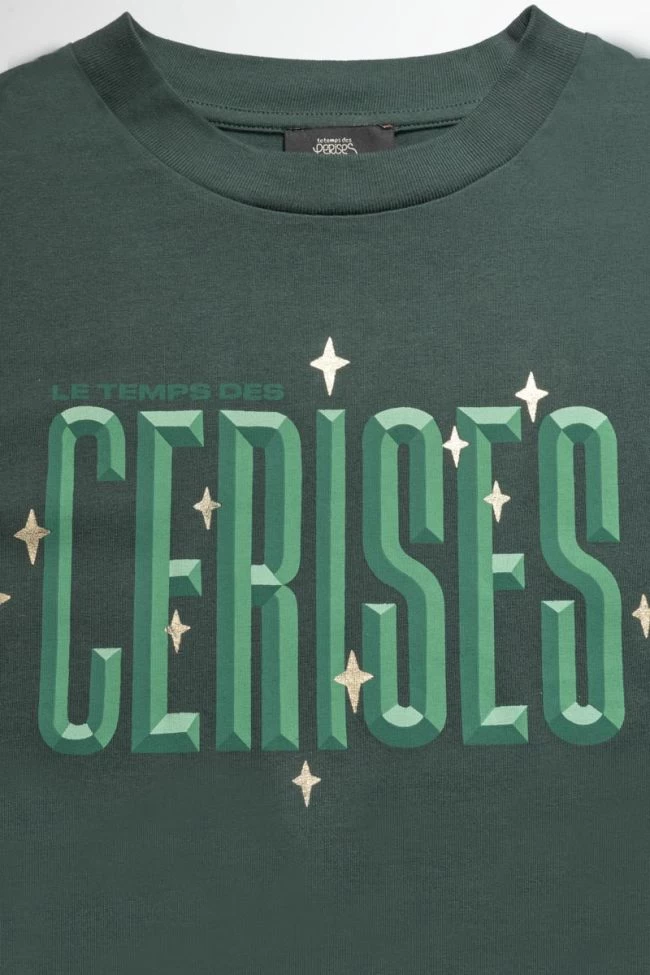 T-shirt Priahgi vert bouteille tendance et girly avec son imprimé ton sur ton Le Temps des Cerises et ses étoiles dorées. Pour plus de style, la coupe est loose et les manches sont à revers cousus.