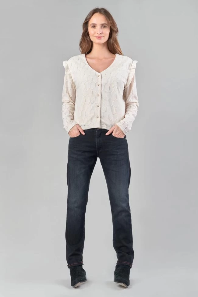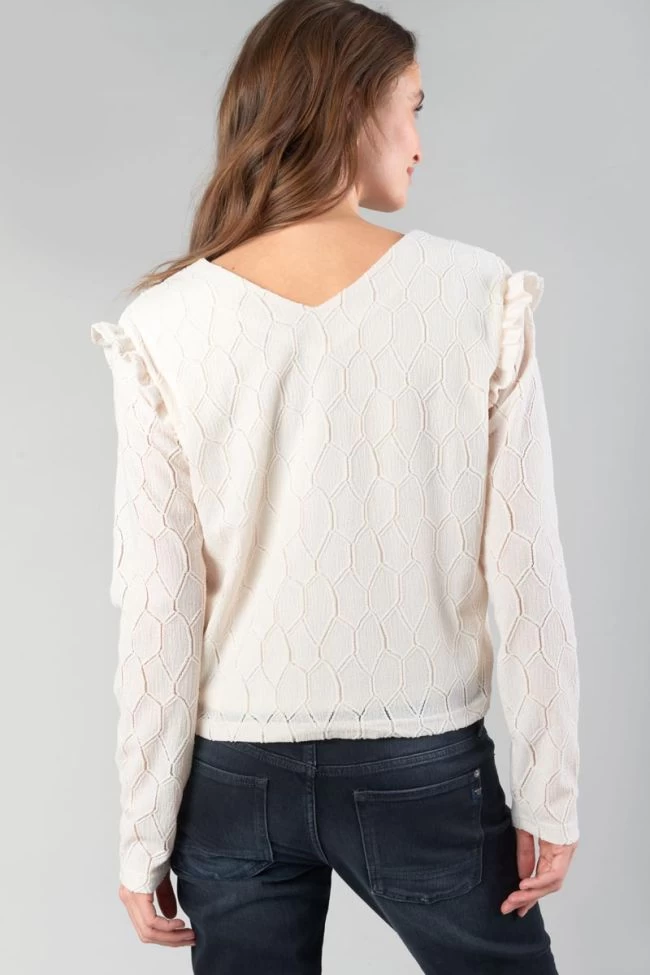 Ce top Esmee est idéal pour des tenues féminines très élégantes avec son tissu agréable à l’effet dentelle très raffiné, ses petits volants au niveau des emmanchures, son col V à l’avant comme au dos ainsi que ses manches qui laissent apparaître une légère transparence. Pour plus de confort, le top est doublé à l’avant et à l’arrière pour limiter la transparence.
