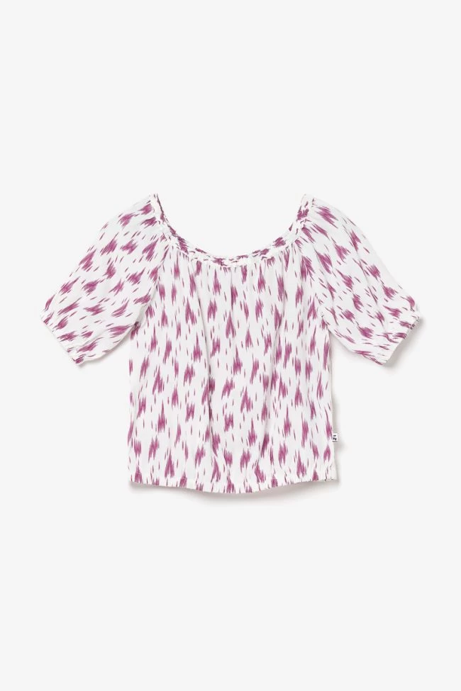 Joli top court Jilogi au motif violet très girly. Sa coupe élastiquée à la taille et aux épaules permet de porter le top épaules couvertes ou dénudées.