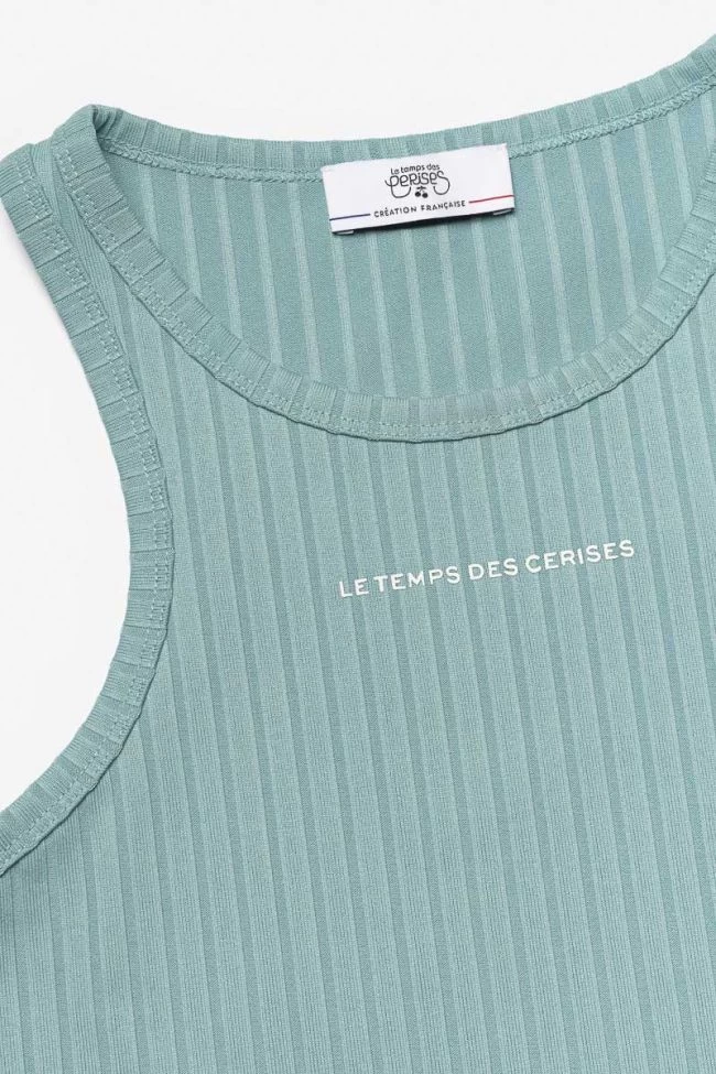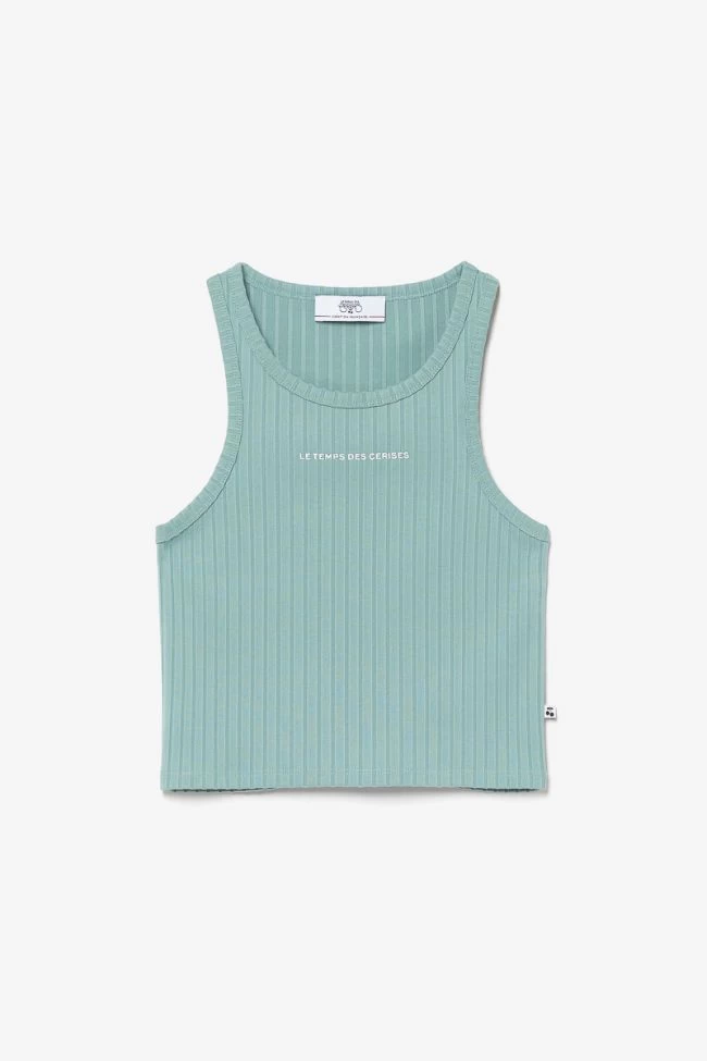 Top Vikengi très tendance avec sa coupe courte et son tissu côtelé, mais également très girly avec sa couleur vert d’eau et son inscription blanche Le Temps des Cerises à l’avant.