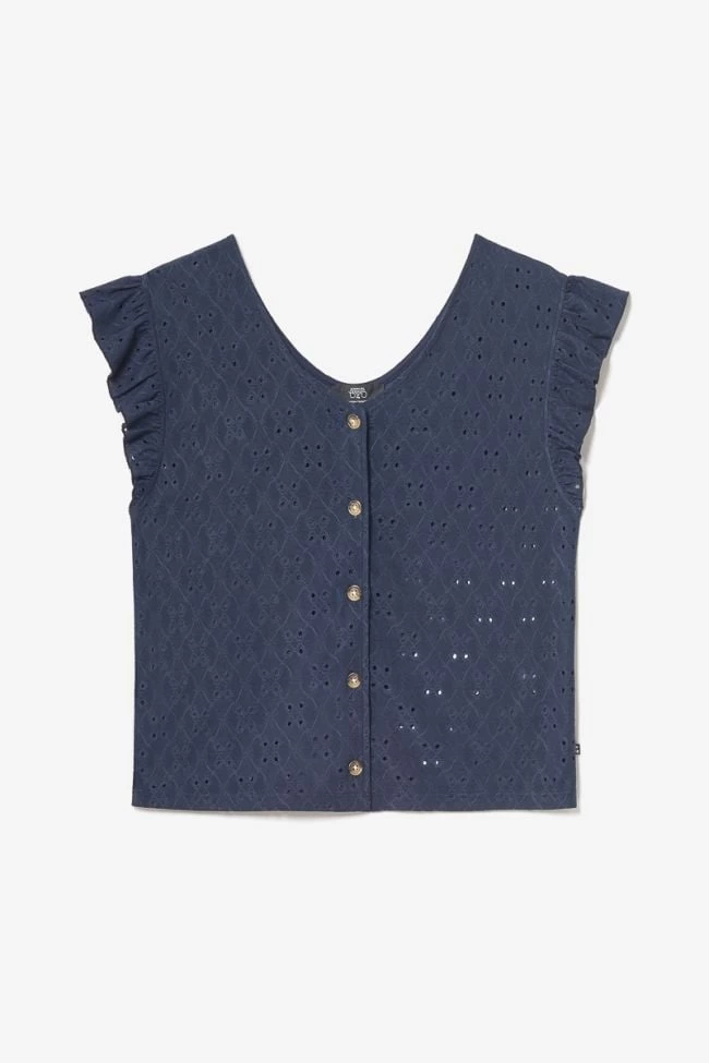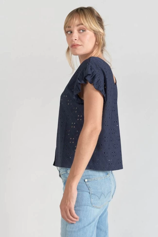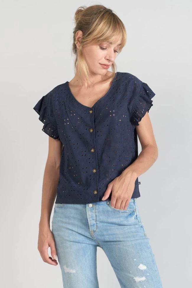 Ce top Pedrina bleu marine ajouré en broderie anglaise est féminin et raffiné grâce à ses détails comme ses volants sur les manches ainsi que ses boutons qui ajoutent le côté chic au top.