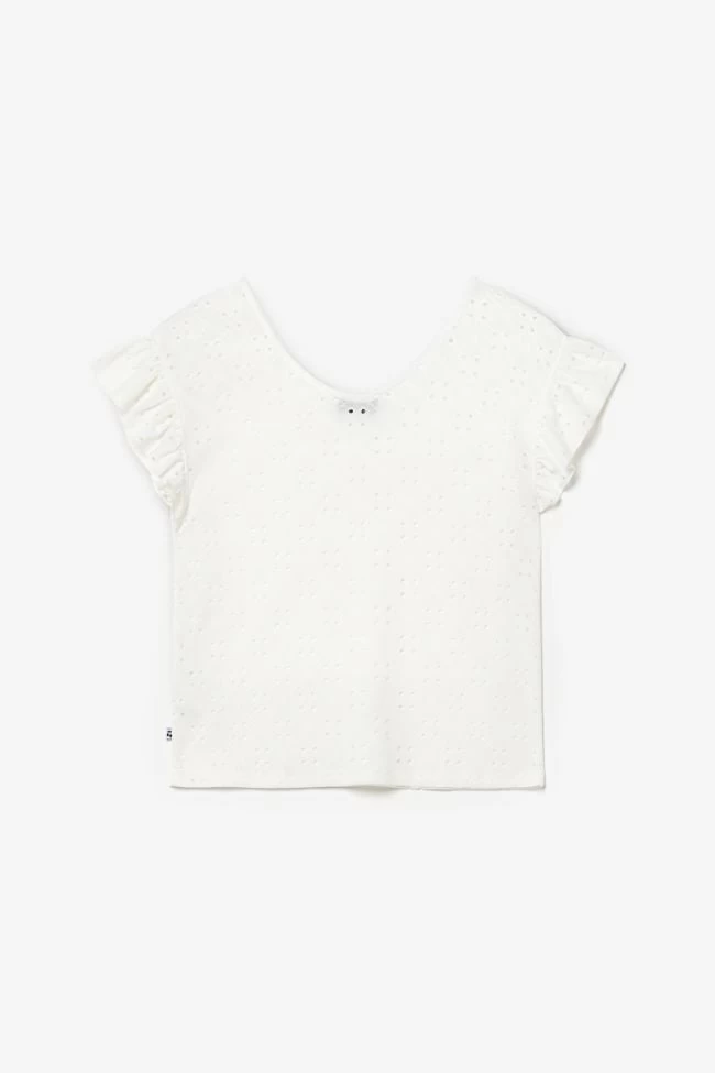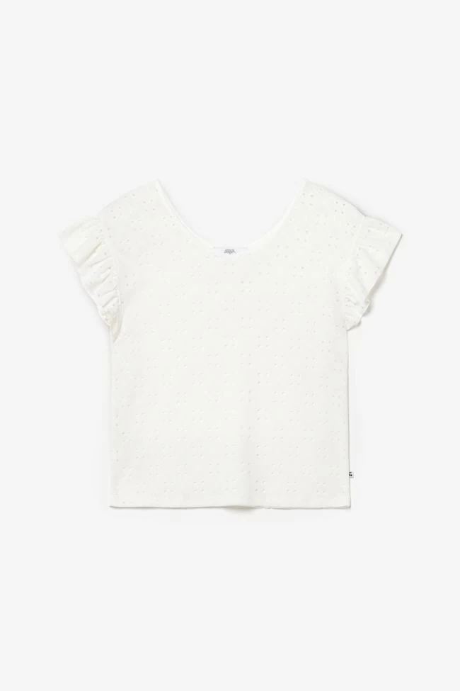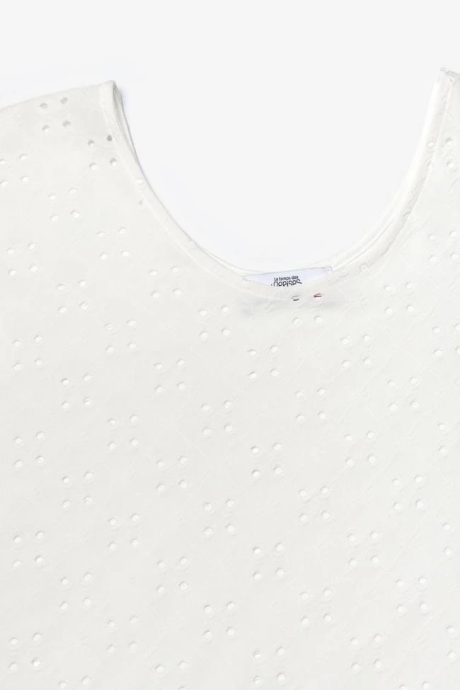 Top Pedrinagi très girly et élégant avec son jersey blanc ajouré pour donner un effet dentelle et ses volants au niveau des épaules. Pour plus de confort, le top est doublé à l’avant.